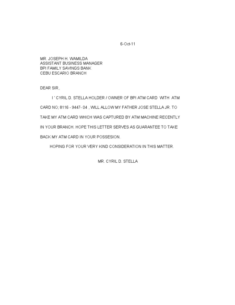 Authorization letter format for bank to collect debit card. Dear bank manager, i am writing this for my wife in case she is questioned when she arrives to collect my bank card. [name, bank and address, ex. Authorization letter to claim atm debit card: